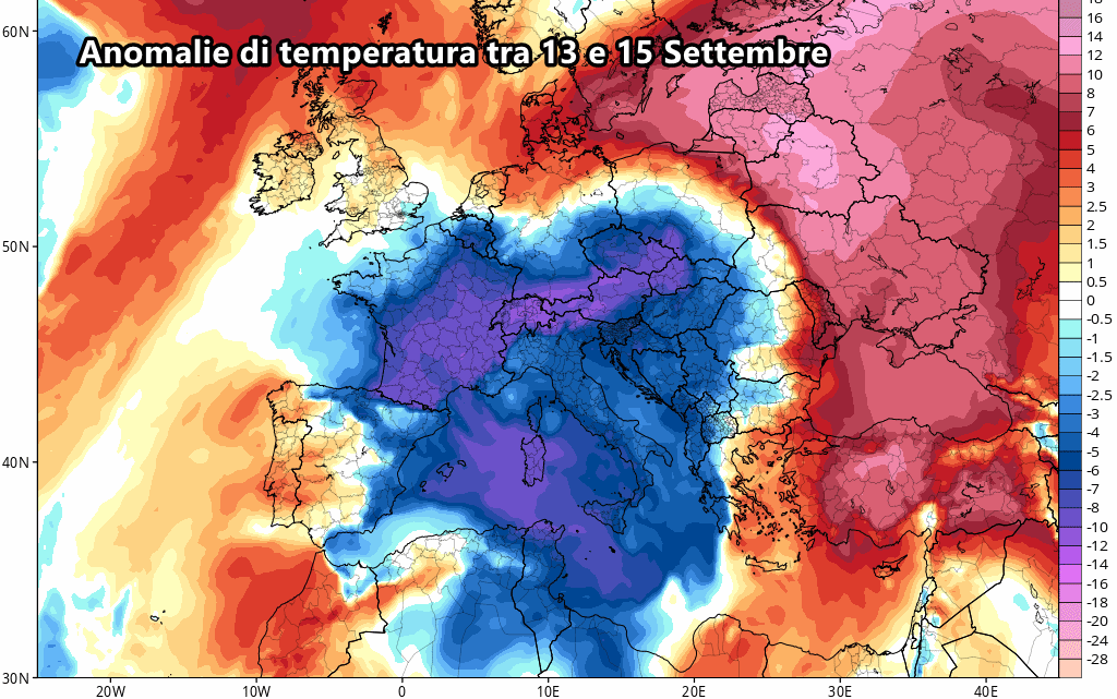 Eloquenti le anomalie di temperatura previste tra 13 e 15 Settembre: tutta Italia e l’Europa centrale si ritroverebbero in un contesto molto più freddo del solito, con valori fino a 10°C sotto le medie.