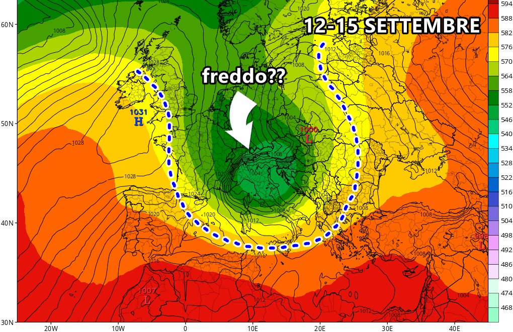 Giovedì 12 Settembre: nuova ondata di maltempo in arrivo, questa volta ad opera di un nucleo molto più fresco proveniente dal polo nord. Netto peggioramento al nord e centro Italia, temperature in calo importante al nord.
