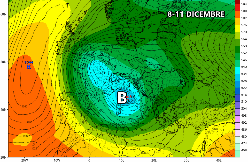 Domenica 8 Dicembre: maltempo che si estende rapidamente a tutta Italia. Insistono piogge al nord, con nevicate fino a bassissima quota tra Piemonte, Oltrepò pavese, Emilia. Neve in collina sul resto del nord. Forte maltempo sul lato tirrenico. Venti forti di libeccio e ostro al Sud.