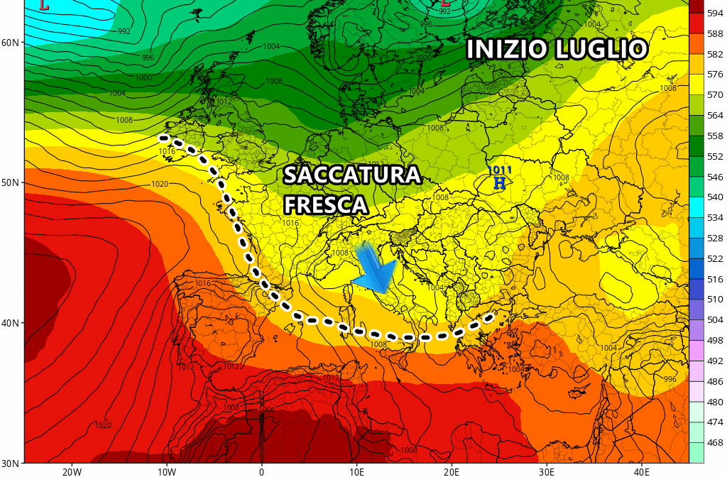 Nel frattempo aria fresca di origine nord-atlantica si muoverà sul bordo dell’anticiclone, andandolo ad erodere sul nord Italia. Ciò significa che rovesci e temporali potranno farsi largo al nord già durante questo week-end, precisamente tra sabato sera e domenica.