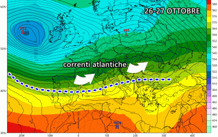 GIovedì 26 ottobre: altra perturbazione in arrivo dall’atlantico in direzione del nordovest, momentaneamente più stabile altrove.