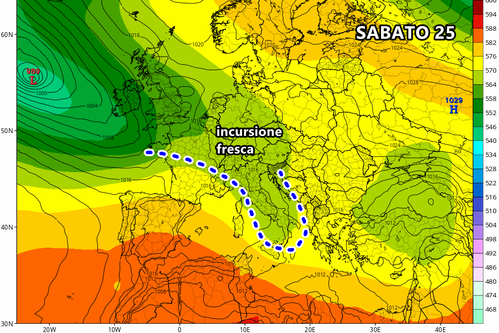 La prossima perturbazione sulla tabella di marcia sta invadendo in queste ore il Nord Ovest, ma sarà la giornata di sabato che vedrà un diffuso peggioramento su buona parte dello stivale. Si tratta di un flusso fresco nordatlantico che porterà anche un calo delle temperature per tutto il fine settimana. Avremo temporali localmente forti anche con delle grandinate, specie sulle regioni centrali e il medio basso versante Adriatico.