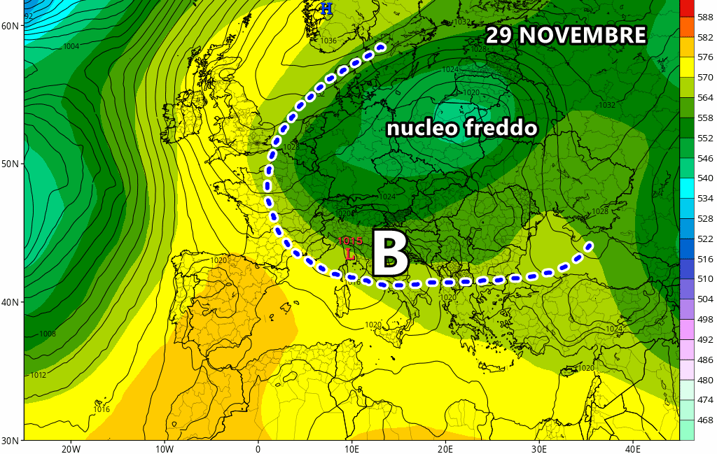 Venerdì 29 Novembre: possibile peggioramento stante la discesa di una depressione dal centro Europa. Maltempo su Nord-est e centro Italia ( da confermare).