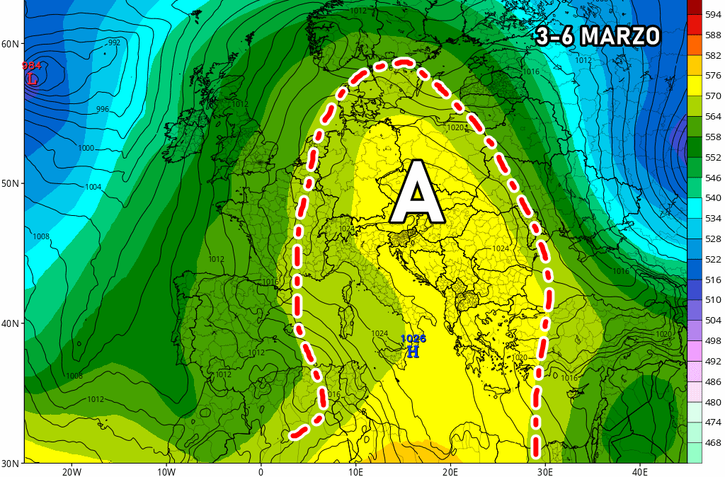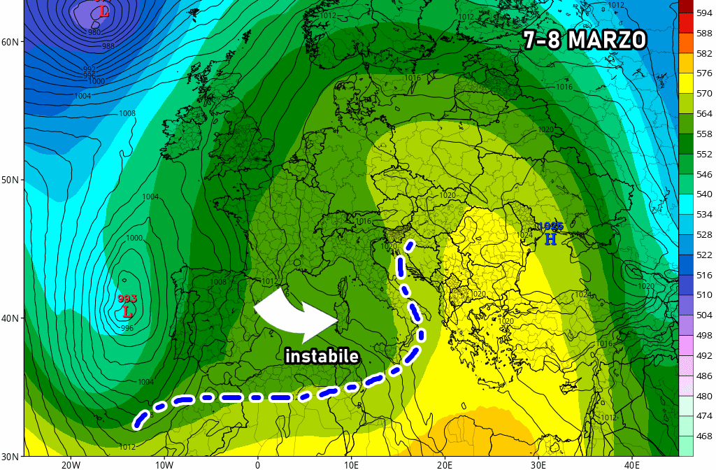 Tuttavia, questo anticiclone non sarà particolarmente resistente e persistente: già tra il 7 e l’8 marzo potrebbero arrivare i primi segnali di cambiamento su alcune regioni. L’alta pressione, infatti, sarà minacciata da insidiose correnti atlantiche, che pian piano andranno a scalfire il bordo occidentale di questa cupola anticiclonica. Inizialmente, saranno interessate la penisola iberica e la Francia, dove il maltempo tornerà già attorno al 6 marzo. Poi, tra il 7 e l’8 marzo, i primi flussi instabili potrebbero raggiungere il Sud Italia, generando nubi e anche piogge.