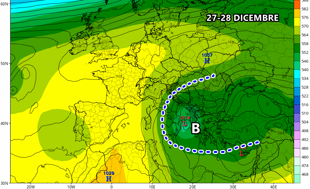 Venerdì 27 Dicembre: nucleo freddo in arrivo dall’est Europa, possibile nuovo peggioramento sul basso Adriatico e al sud, con neve in collina. Persiste la stabilità al nord.