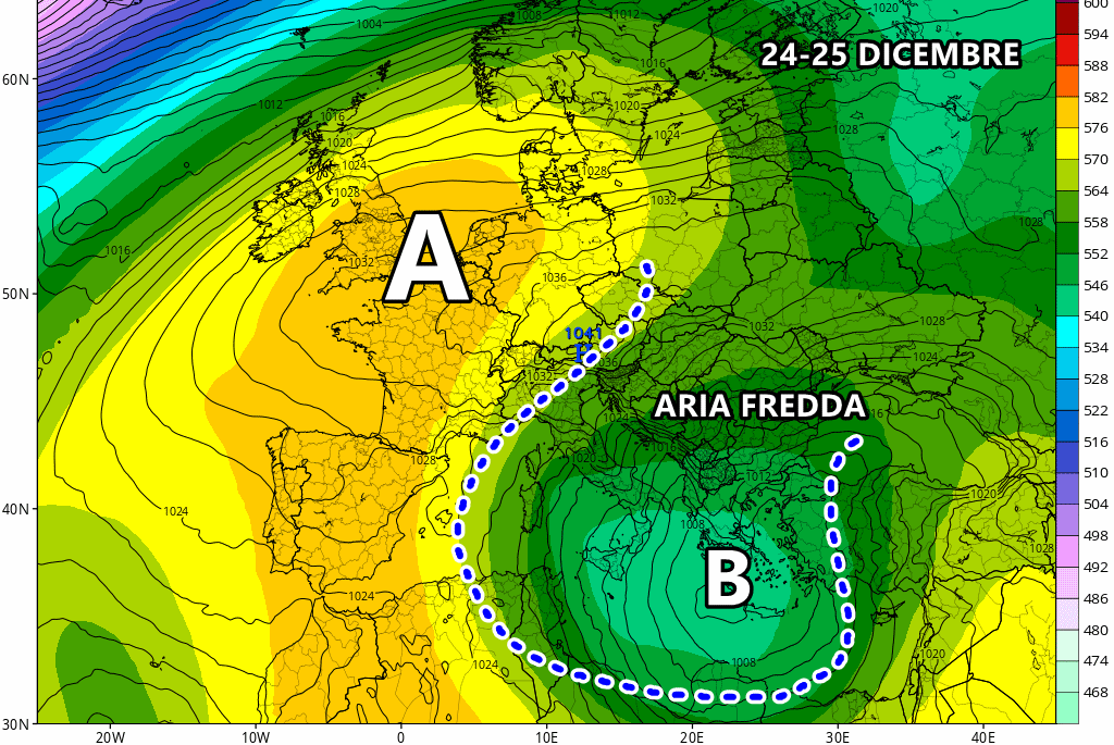 Martedì 24 Dicembre: apice del maltempo al centro-sud nel giorno della Vigilia di Natale. Venti burrascosi di tramontana, piogge diffuse, nevicate fino in collina! Fiocchi fino a 300 metri tra Abruzzo e Molise, 700 metri all’estremo sud. Sole al nord.