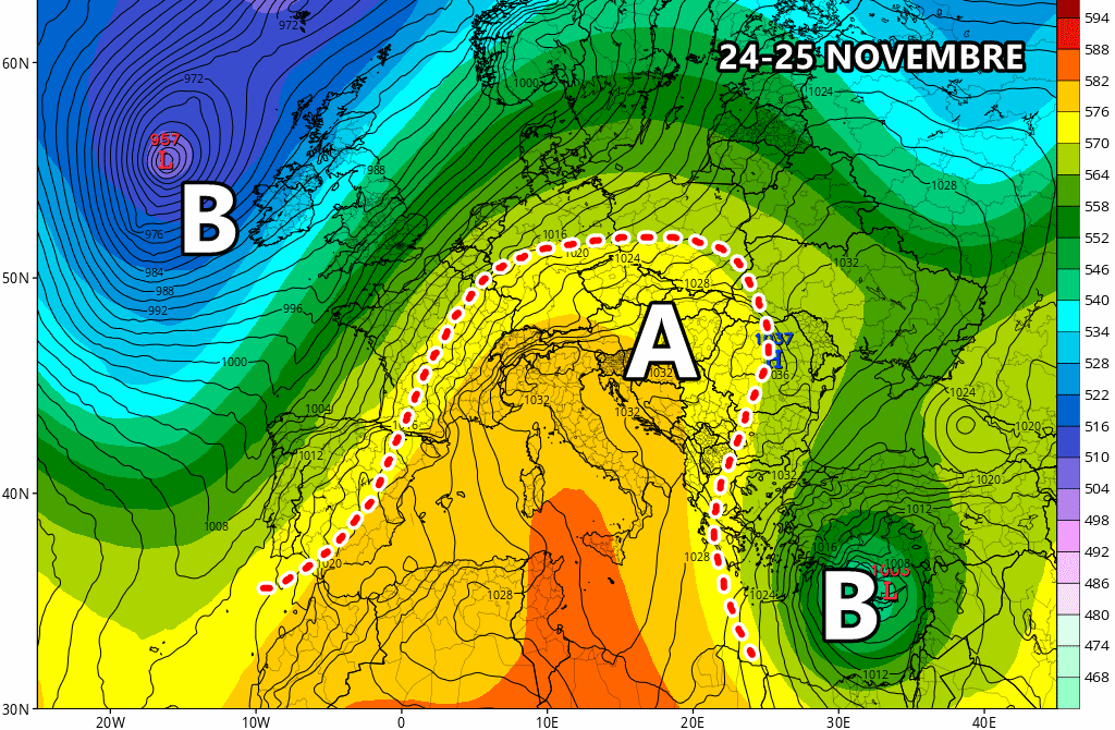 Lunedì 25 Novembre: generalmente stabile, eccetto nubi al nord e qualche piovasco sul nord-ovest. Nebbie in Val Padana.