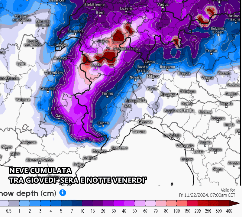 La massa d’aria fredda darà vita ad una nuova depressione nel corso di giovedì, la quale a sua volta innescherà precipitazioni sul Nordovest e l’arco alpino: il calo termico sarà improvviso su tutta la Val Padana, tanto da permettere l’arrivo della neve a bassa quota in Piemonte e fin nei fondovalle alpini e prealpini. I fiocchi potrebbero raggiungere anche Torino, con possibilità d’accumulo. La quota neve si spingerà fin sui 250-300 metri in Piemonte, fino a 400 metri in Lombardia, Trentino alto Adige.