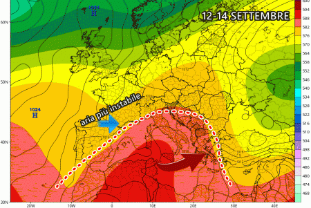 L’anticiclone nordafricano tenderà pian piano a spostare il proprio asse verso est e i massimi di pressione, geopotenziale e di temperatura interesseranno principalmente il meridione e le isole maggiori. Questo significa che il Nord Italia, il medio-alto Tirreno e, parzialmente, anche la Sardegna, si ritroveranno esposti alle correnti più umide provenienti da ovest, ovvero dall’Atlantico. Queste correnti daranno luogo a una locale instabilità con fenomeni sparsi, soprattutto a partire dal 13 e 14 settembre, quando saremo ormai a ridosso della metà del mese. Insomma, ciò indica che le piogge, anche se non particolarmente intense, stanno per tornare a interessare diverse delle nostre regioni dopo un periodo particolarmente secco.