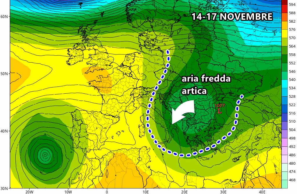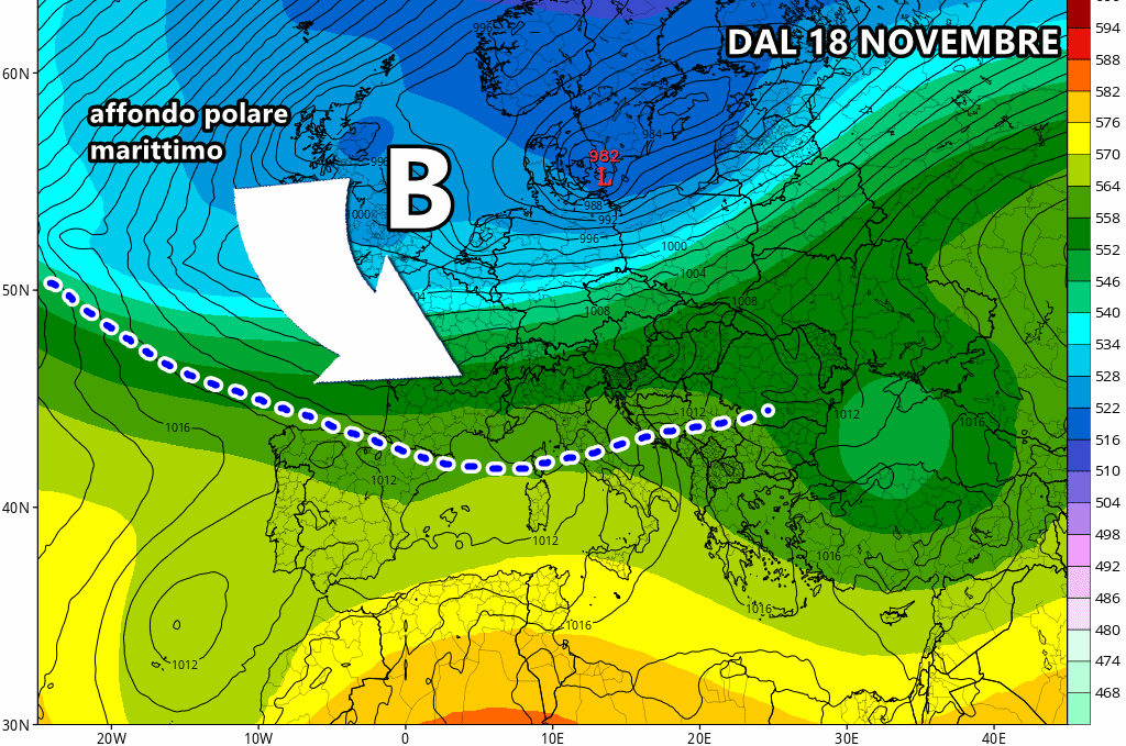 Dulcis in fundo, dal 18 novembre potrebbe fare il suo ingresso una vastissima saccatura fredda polare-marittima, proveniente dalla Groenlandia, pronta a gettare il nord Italia sotto piogge, rovesci e nevicate (in montagna).
