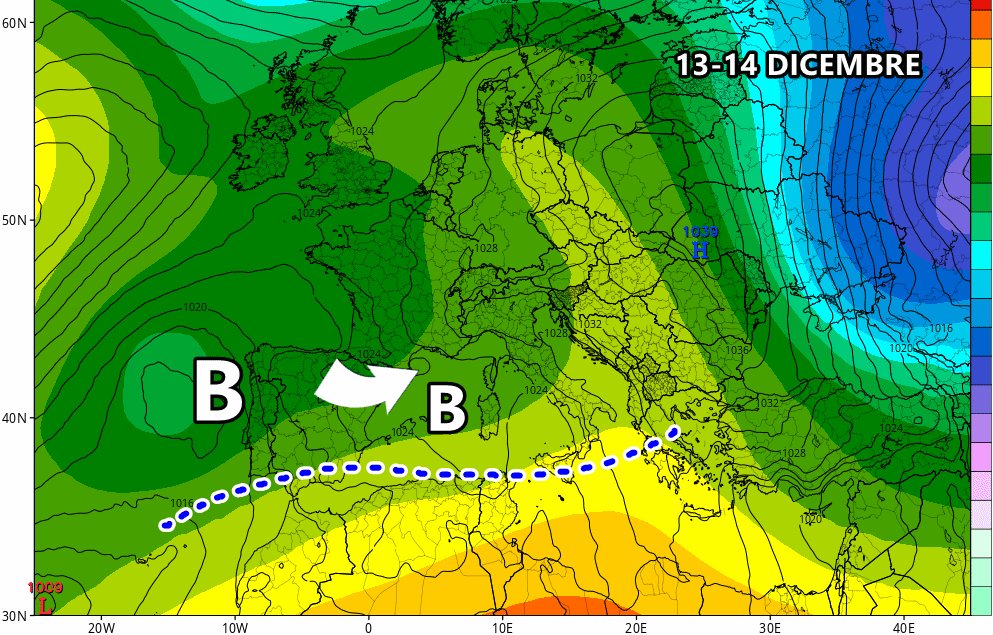 Venerdì 13 Dicembre: da valutare il passaggio di una nuova perturbazione su gran parte del centro e del sud, con neve in montagna. Piogge veloci su Liguria, Emilia Romagna, Veneto, con neve in collina (da confermare).