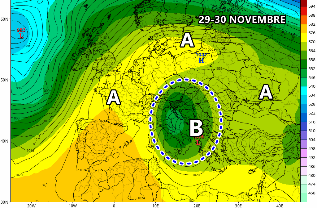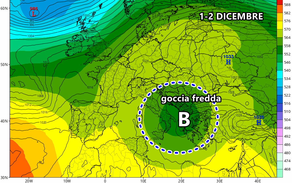 In effetti questa perturbazione potrebbe isolarsi sul centro-sud Italia per almeno 4 giorni, dal 29 novembre al 2 Dicembre. La goccia fredda in cut-off sarà responsabile anche di nevicate in Appennino, con accumuli degni di nota oltre i 1.000-1.200 metri di quota. Qualche fiocco, tuttavia, si mostrerà fino in alta collina tra Abruzzo e Basilicata, dove la neve durante i rovesci più intensi potrebbe abbassarsi fino a 500m.