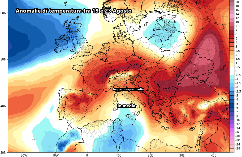 La rinfrescata ci farà compagnia almeno fino a martedì, dopodiché le temperature riprenderanno pian piano a salire grazie al pronto ritorno dell’anticiclone. Fortunatamente non si prevedono picchi di caldo estremi come quelli vissuti di recente. In effetti le anomalie medie previste tra 19 e 23 Agosto ci mostrano un’Italia sotto temperature attorno alle medie o leggermente superiori.