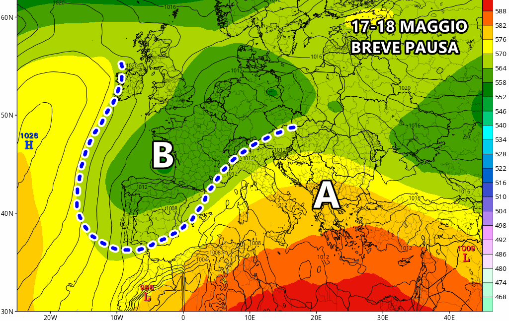 Giovedì 16 Maggio: temporali diffusi al nord e al centro. Fronte caldo al sud con rischio piovaschi sporchi di polvere. Tanta sabbia sahariana in alta quota, specie al sud.