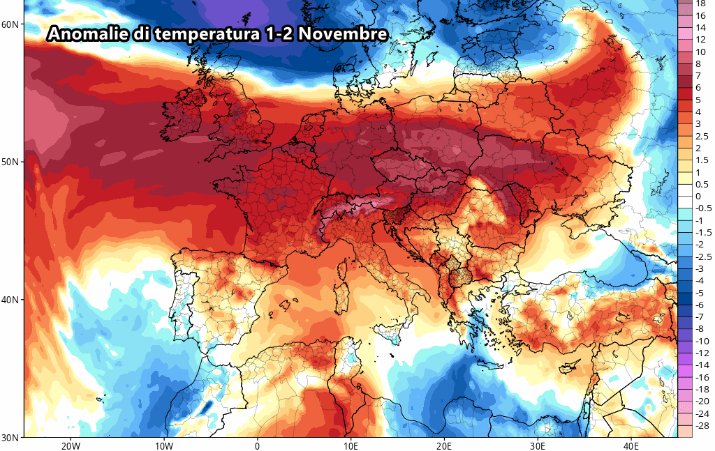 Le temperature, ovviamente, aumenteranno su gran parte dell’Europa centro-occidentale.. Al Nord si prevedono temperature fino a 4°C sopra le medie del periodo ad inizio Novembre, percepibili maggiormente di giorno.