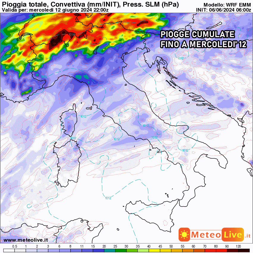 Ecco le piogge cumulate previste fino al 12 Giugno: