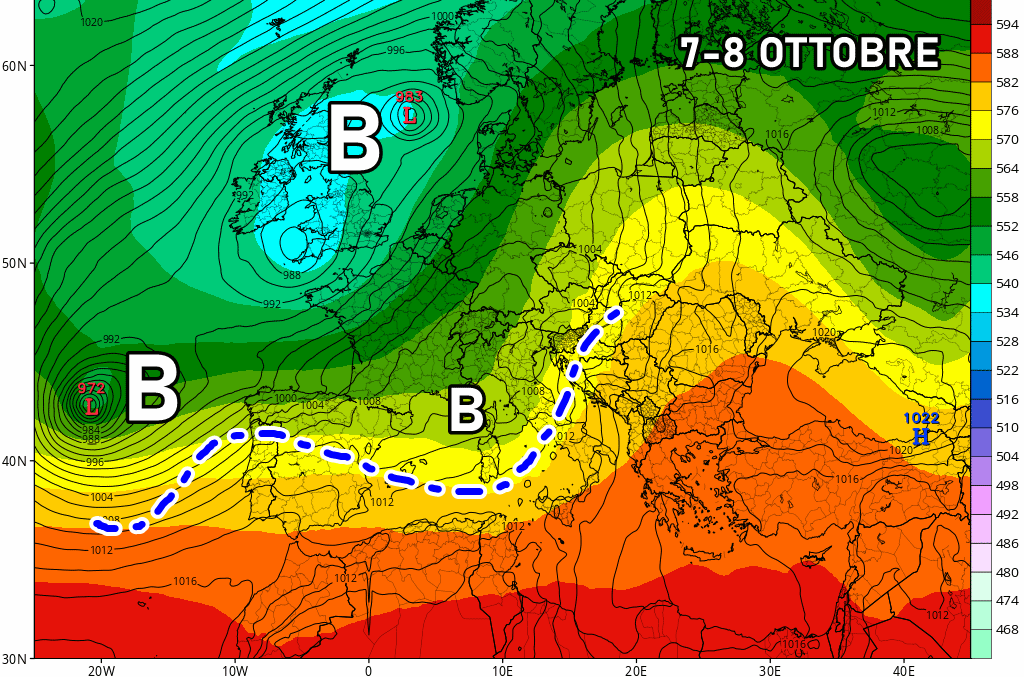Martedì 8 Ottobre: veloce perturbazione in transito su centro e nord Italia, con rischio locali forti temporali sulla fascia tirrenica e a ridosso di Alpi/Prealpi. Temperature in aumento specie al sud.