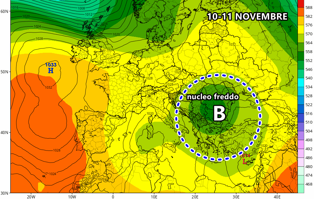 Lunedì 11 Novembre: nucleo freddo tra sud Italia e Balcani, temperature in calo ovunque. Instabile sulle isole maggiori, isolati rovesci anche su Puglia e Calabria.