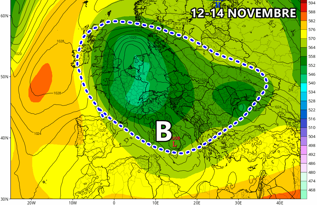 Cambia tutto la prossima settimana: l’anticiclone leverà definitivamente le tende lasciando spazio ad una depressione molto ben organizzata che potrebbe avvolgere buona parte d’Italia, specie dal 13 novembre in poi. Questa depressione sarebbe alimentata da un nucleo freddo artico, proveniente da nord-est. Oltre a piogge e temporali potrebbe arrivare la prima neve a quote di montagna, occasionalmente anche più in basso al nord Italia (sebbene la probabilità al momento resti bassa).
