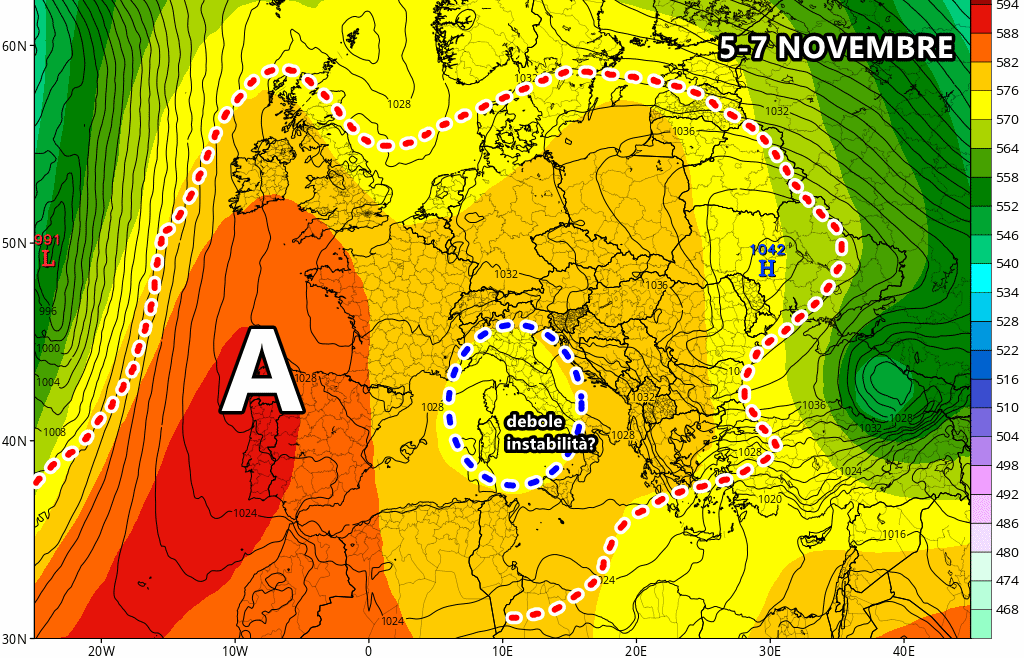 Tra 5 e 7 Novembre la cupola anticiclonica potrebbe subire delle modifiche strutturali e di posizione, traslando più ad ovest. In tal caso ci potrebbero dei leggeri disturbi in alta quota, che potrebbero arrecare isolati piovaschi sulle isole maggiori e molto marginalmente sul centro Italia. Ma per il momento siamo ben lontani dal parlare di vere perturbazioni!