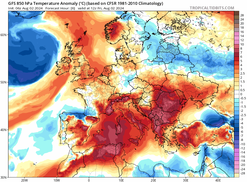 In tutto questo, avremo un lieve calo delle temperature da nord a sud grazie a queste correnti un po’ più fresche nord-occidentali che riusciranno a spazzar via parte della calura nordafricana. In ogni caso, le temperature resteranno pur sempre al di sopra delle medie del periodo su tutto lo stivale, come si evince dalla simulazione delle anomalie.