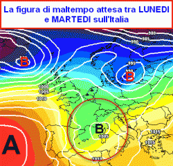 La cartina qui di fianco riportata inquadra la situazione sinottica attesa nella notte tra lunedì e martedì in Italia.