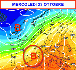 Un secondo attacco perturbato da ovest ( lo vediamo nella cartina a fianco riportata) diverrà realtà al nord e sulla Toscana nella giornata di mercoledì 23 ottobre, quando si attende un nuovo carico di piogge.
