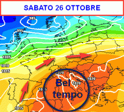 La seconda cartina mette in luce la situazione sinottica attesa per la giornata di sabato 26 ottobre in Italia.