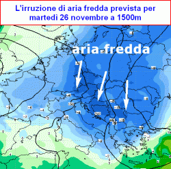 Nella prima fase però da lunedì 25, ma soprattutto da martedì 26 a giovedì 28 lungo il suo bordo orientale e meridionale affluirà verso l’Italia aria fredda dai quadranti orientali. Essa determinerà la prima vera mini ondata di