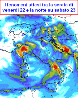 sabato 23: rientro del maltempo al nord con piogge in estensione da est verso ovest, ma con effetti più marcati su basso Piemonte, Appennino ligure ed Emilia-Romagna, dove nevicherà sino a circa 600-700m ma con limite in rialzo. Tempo molto instabile anche sul resto del Paese e ancora molti rovesci o temporali possibili ovunque, più intensi sul basso Tirreno, ma anche la Toscana. Temperature in rialzo.