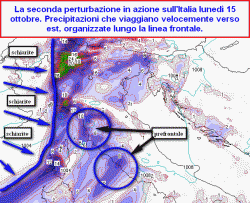 Lunedì 15 ottobre: il fronte freddo investe il nord partendo dalle regioni nord-occidentali. Precipitazioni che nel pomeriggio guadagneranno anche i settori centrali tirrenici sino alla Campania. Tra tardo pomeriggio e la serata precipitazioni copiose a ridosso delle Alpi e Prealpi venete e friulane.