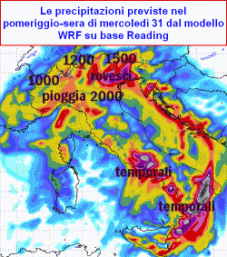 mercoledì 31 ottobre: maltempo ovunque a partire da ovest con fenomeni che durante la mattinata interesseranno soprattutto la Sardegna, la Sicilia meridionale ed orientale, il Mar Tirreno ed il nord-ovest, dove in Piemonte potrà nevicare localmente sino in collina nel Cuneese e sino ad 800-1000m sul restante arco alpino occidentale, nel pomeriggio fenomeni ovunque, intensi in serata su Lazio, Campania, Valpadana, Friuli Venezia Giulia, poi Calabria jonica e Salento, deboli o moderati altrove, quota neve tra 1000 e 1500m sulle Alpi, in graduale rialzo, a 2000m su nord Appennino. Ventoso ovunque, temperature massime in calo al nord, in calo ma più miti al centro-sud.