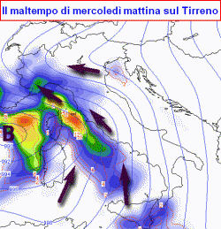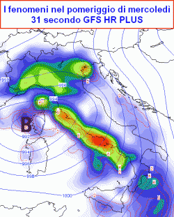 Una depressione al suolo si andrà approfondendo a ridosso tra Corsica e Sardegna nella mattinata di mercoledì, raggiungendo valori pressori intorno ai 989-990hPa e rallentando un po’ lo spostamento verso levante dell’attiva perturbazione ad essa connessa, sostenuta oltretutto dal ramo ascendente della corrente a getto.