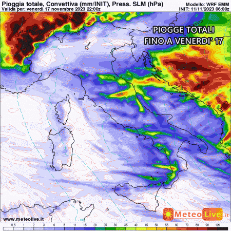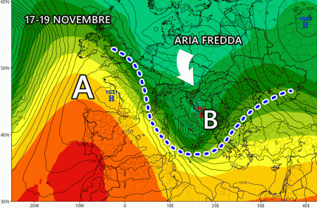 Venerdì 17 novembre: forte peggioramento ad opera di un ciclone tirrenico alimentato da fredde correnti nord-europee. Temperature in forte calo ovunque, neve in montagna.