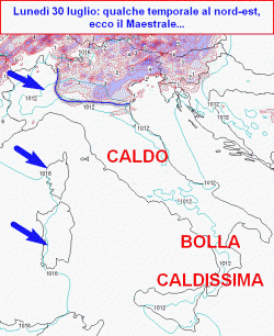 A meno di clamorosi ed improbabili ribaltoni, il tempo dovrebbe andare avanti così almeno sino a domenica 5 agosto, forse anche oltre: al nord piccoli disturbi temporaleschi, più marcati nelle Alpi, al centro-sud solo e caldo con qualche intervallo dal clima più sopportabile favorito dall'inserimento del Maestrale. Una situazione che ormai si trascina da parecchio.