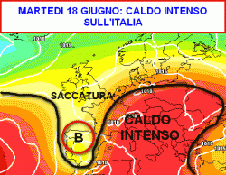Dal punto di vista sinottico, ecco la situazione prevista per la giornata di martedì 18 giugno. Saremo probabilmente nel momento topico di questa prima ondata estiva.