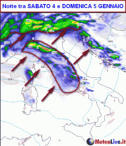 Sabato 4 gennaio: nuovo peggioramento al nord ad iniziare da ovest con piogge anche intense e neve sopra gli 800 metri. Estensione delle piogge in giornata anche al Tirreno, ancora asciutto altrove. Ventoso e piuttosto mite.