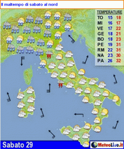 SABATO 29 SETTEMBRE: maltempo al nord e sull’alta Toscana, con precipitazioni frequenti, a tratti anche estese e sotto forma di rovescio. Possibili temporali su Liguria e Versilia. Clima ventoso e calo termico atteso al nord. Apice del caldo al sud, con punte fino a 34°C in Puglia.