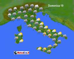 domenica 19: ancora pioggia al nord e neve oltre i 900-1200m, al centro-sud instabile con temporali, specie sulle regioni tirreniche e lieve calo delle temperature.