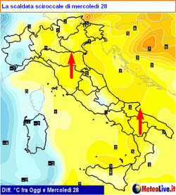 MERCOLEDI 28 maltempo al nord, versanti tirrenici del centro-sud e ovest Sardegna, con piogge diffuse, anche temporali sul Tirreno. Variabilità altrove. Venti meridionali e clima ancora relativamente mite, con incipiente diminuzione delle temperature sulle Alpi occidentali. Quota neve in lieve calo sulle Alpi.