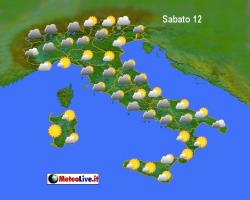 sabato 12 ottobre: tempo instabile al nord e al centro con rovesci sparsi passeggeri in movimento da sud ovest verso nord-est, più probabili dapprima su ovest Alpi, poi su nord-est e regioni centrali, limite della neve a 1500m sulle Alpi, al sud qualche rovescio in Campania, per il resto passaggi nuvolosi innocui e temperature in aumento.