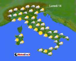 lunedì 14 ottobre: abbastanza soleggiato con passaggi nuvolosi al nord e sul Tirreno ma senza fenomeni. Ancora un po’ fresco al nord, mite al centro, ancora caldo al sud, ma in attenuazione.