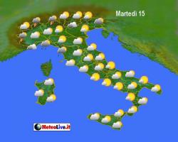 martedì 15 ottobre: peggiora al nord con piogge e rovesci, specie su Alpi, Liguria, regioni di nord-est, in giornata peggiora anche al centro, ancora bello al sud.