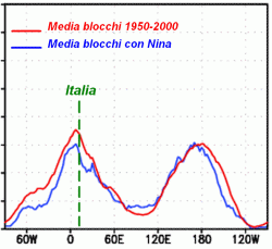 E’ stato rilevato inoltre che la frequenza e l’intensità dei blocchi atmosferici subisce alcune modifiche in relazione al ciclo dell’ENSO e risulta più tenace in caso di Nino, meno nei casi di Nina. Questo perchè tale ciclo modifica la distribuzione della pressione sul comparto pacifico e indiano portando allo sviluppo di onde atmosferiche (alte e basse pressioni) di lunghezza e parametri appropriati al rallentamento e al blocco. La figura allegata (cluster azzurro) mostra l’andamento statistico dei blocchi in caso di Nina.