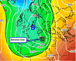 Da qui le condizioni di pesante maltempo cui abbiamo accennato poc’anzi. Come esempio di questo processo si ricordi la celebre "Genova low", ossia il centro di bassa pressione che si forma sul golfo di Genova come processo di ciclogenesi sottovento alle Alpi, all’origine di abbondanti precipitazioni su tutto il settentrione d’Italia.