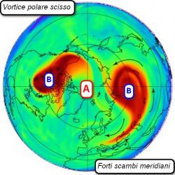 Questa intrusione causa notevole attrito e pertanto genera un riscaldamento, che può essere anche di 60-70 gradi in una settimana. E’ il cosiddetto Stratwarming. Il vortice polare stratosferico viene destabilizzato e, in casi estremi, questa destabilizzazione si può propagare verso il basso fino a spostare o addirittura scindere il vortice polare anche al livello del mare (figura qui a fianco).