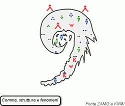 Nel caso della Comma, dobbiamo osservare che la struttura vorticosa è sempre legata alla presenza di un vortice di vapore acqueo in quota (di quelli sopra menzionati per intenderci), ma presenta caratteristiche ben visibili anche al suolo: sono i classici impulsi di instabilità post-frontali, dovuti allo sviluppo ciclonico dell’aria fredda in prossimità dell’asse della saccatura principale (vorticità da curvatura). Portano situazioni di forte instabilità, esaltate soprattutto durante la stagione estiva quando possiamo aspettarci i classici rovesci a "campione" che seguono le precipitazioni diffuse legate alla perturbazione principale ormai lontana. Durante l’inverno possono causare rovesci di neve fino a quote basse per rovesciamento convettivo del nucleo freddo di cui sono formati.