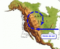 Ma cosa accade se il flusso arriva da est? La forza deviante dirotterà la corrente verso destra ossia verso nord. Il flusso acquisterà così una componente rotazionale anticiclonica, ma salendo di latitudine la vorticità planetaria aumenta dunque dovrà diminuire quella relativa. Ecco che il vento invertirà la direzione puntando prima verso est per poi avvitarsi ancor più anticiclonicamente disegnando una circolazione chiusa che rimarrà sopravvento alla catena montuosa (seconda figura).