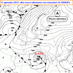 Ma torniamo ai nostri antagonisti: anticiclone africano e anticiclone russo-siberiano. Per quanto detto sopra non è ora difficile comprendere perchè i ciclopi del caldo proveniente dal Continente Nero, tipici della stagione estiva, assumono valori di pressione al suolo raramente superiori a 1015hPa, mentre i signori del gelo siberiano invernale, costituiti da aria pesantissima, possono presentare valori, come detto, anche fino a 1060hPa. Un esempio nella figura qui a fianco, risalente al 31 gennaio del 2012.