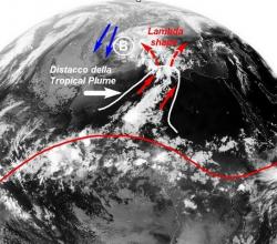 Se quest’onda risulta sufficientemente incisiva, può spingersi ancora più a sud e riuscire ad agganciare le cosiddette "easterlies", ossia le correnti orientali generate dagli Alisei tropicali, causando il distacco di una frangia temporalesca tropicale dalla ITCZ, ossia la Linea di Convergenza Intertropicale. E’ quello che sinotticamente si chiama Tropical Plume. Questa banda nuvolosa, formata inizialmente per lo più da nubi medio-alte irregolari, reca aria potenzialmente molto carica di calore ed umidità e viene poi risucchiata dalla Corrente a Getto Subtropicale e spinta fin verso il Mediterraneo centrale, dove tende a interagire con la depressione che l’ha stimolata.